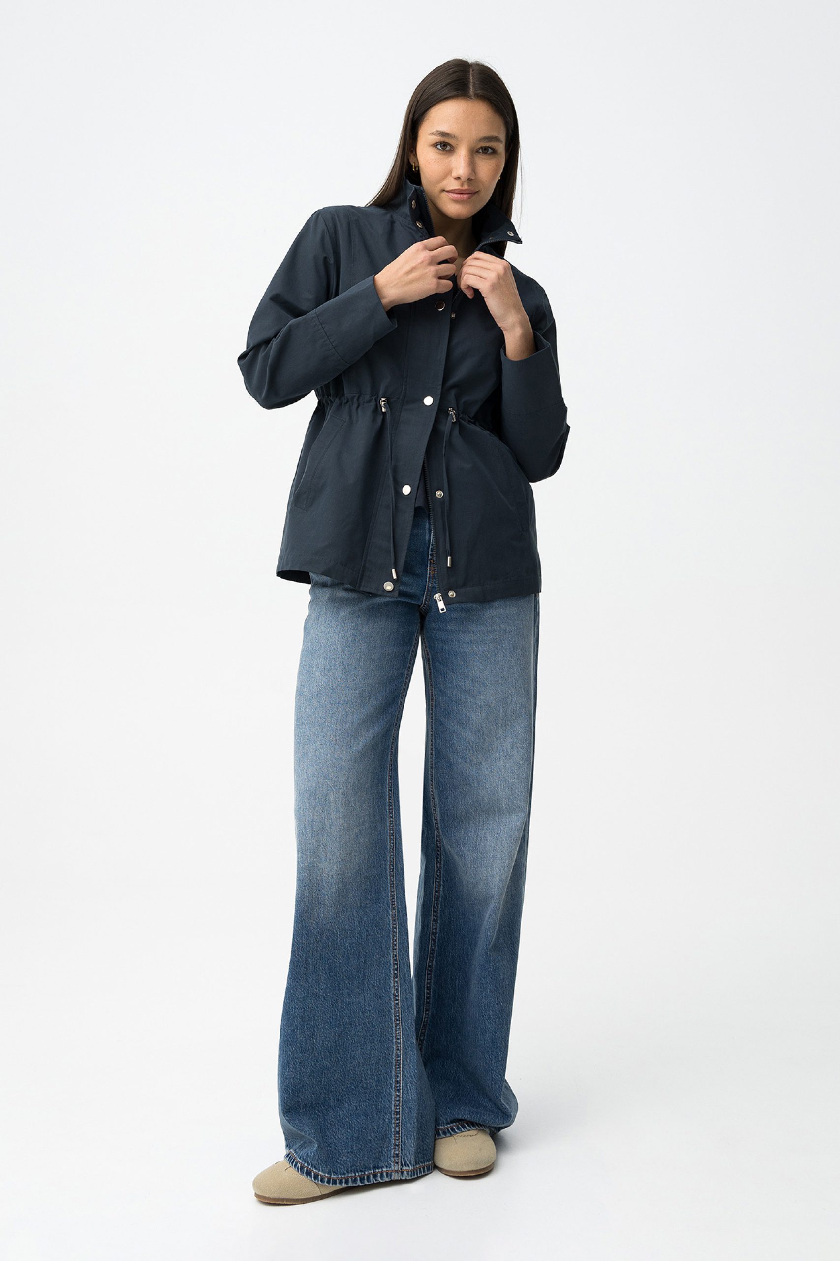 - Adjustable waist and metal button fastening.