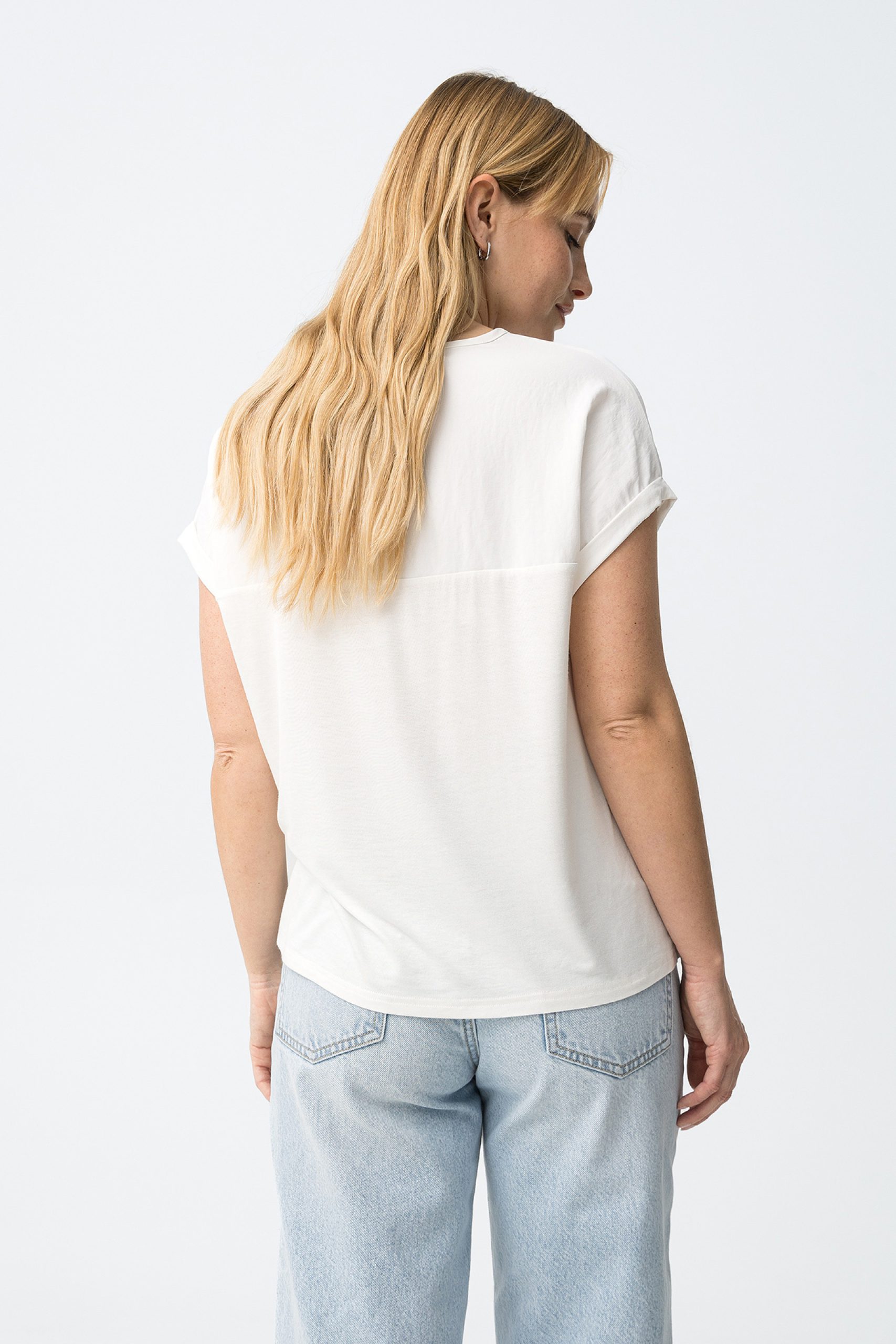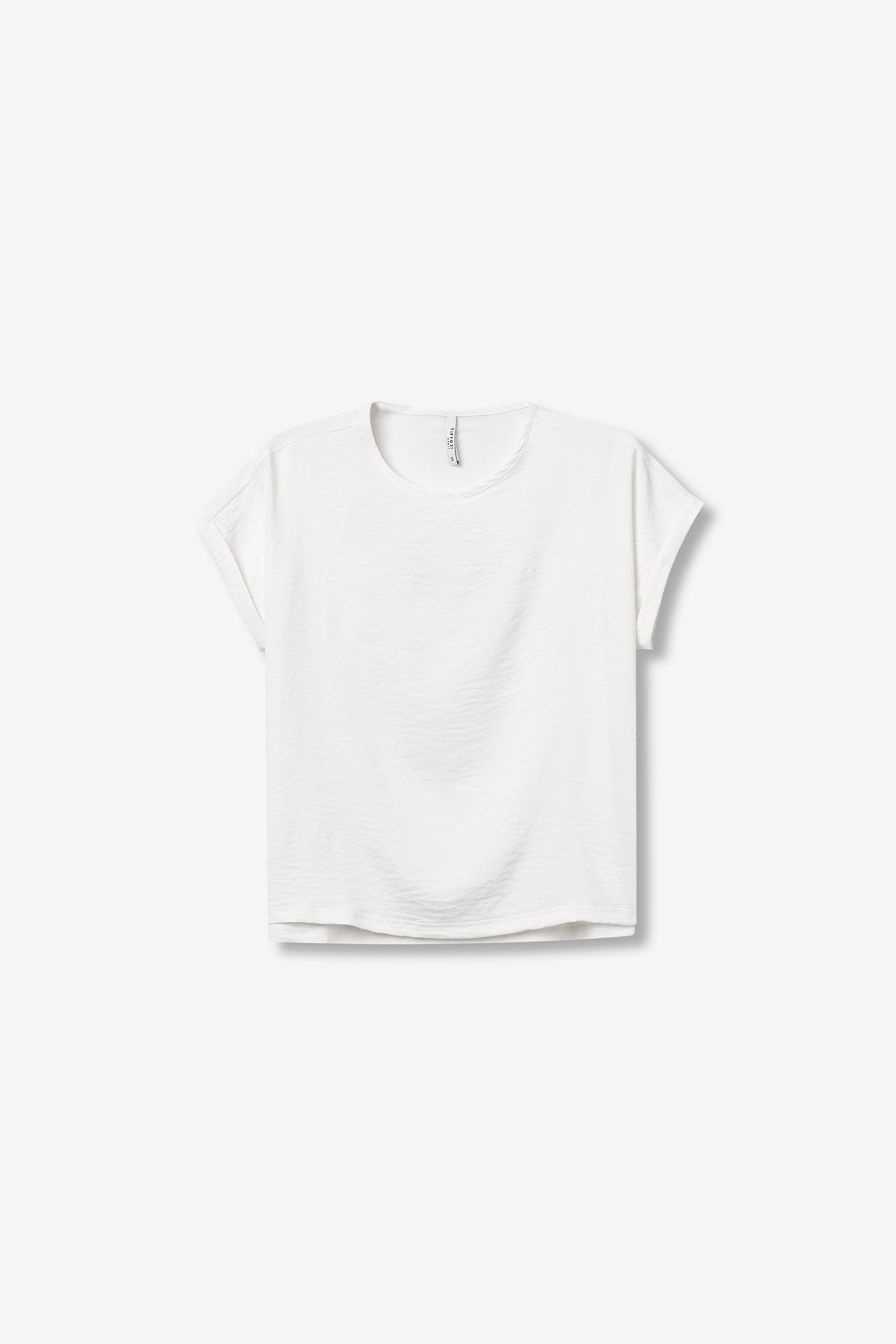 - Short rolled sleeves and a round neckline
