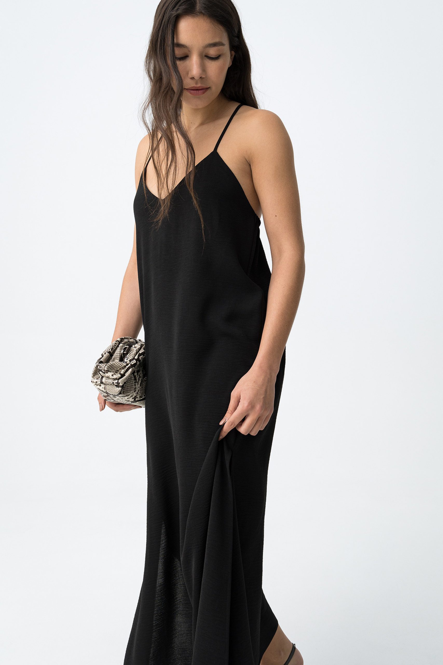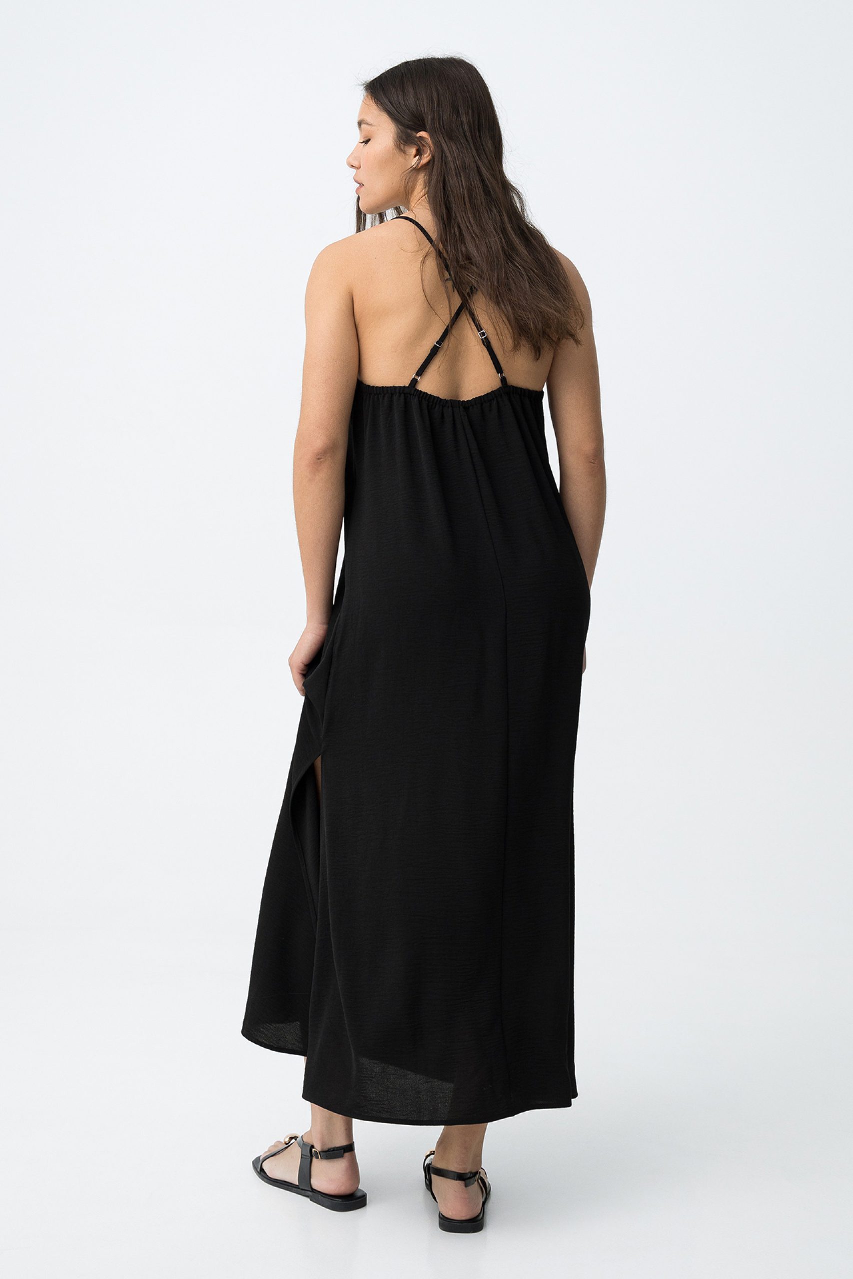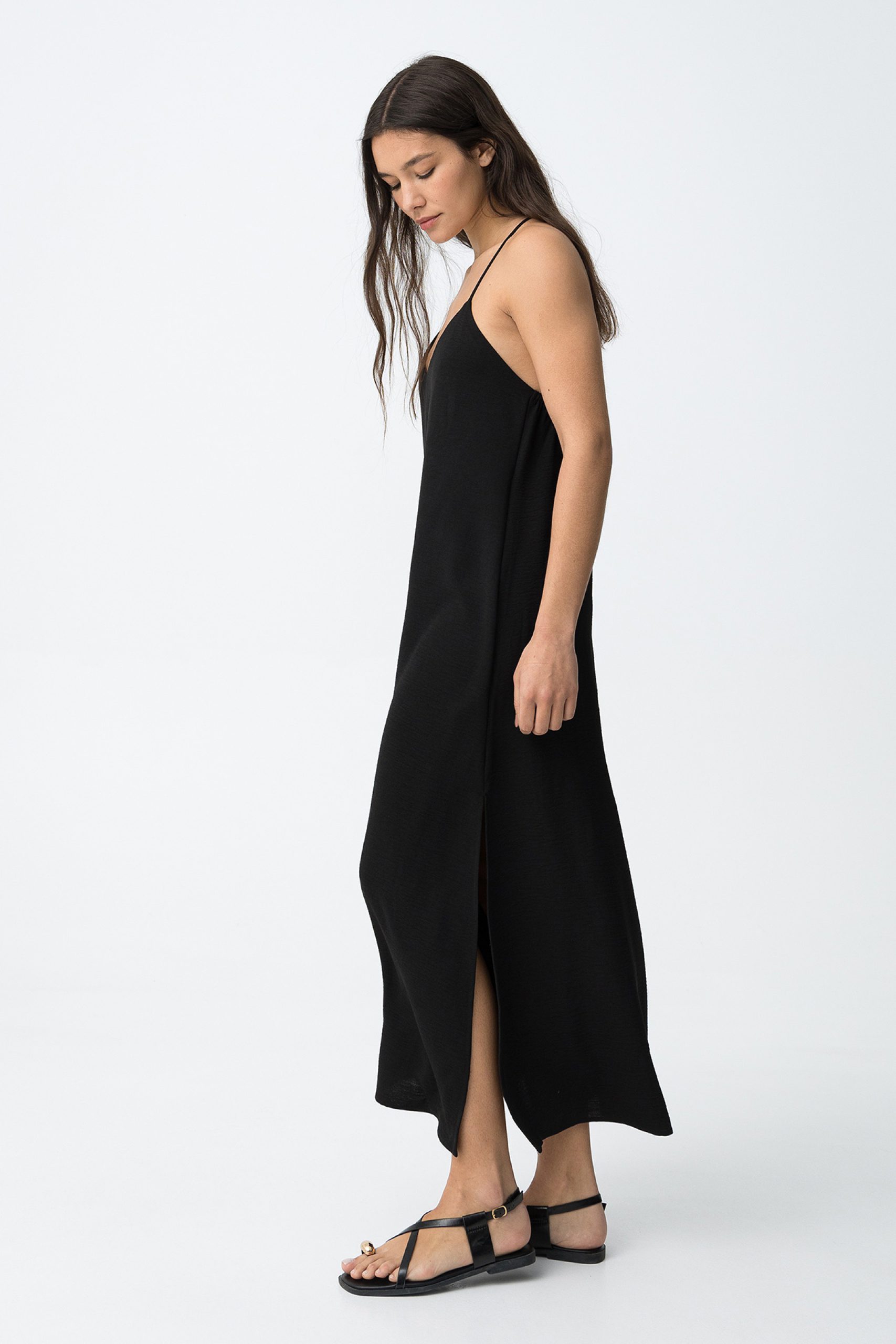 - Loose-fitting black dress with thin straps