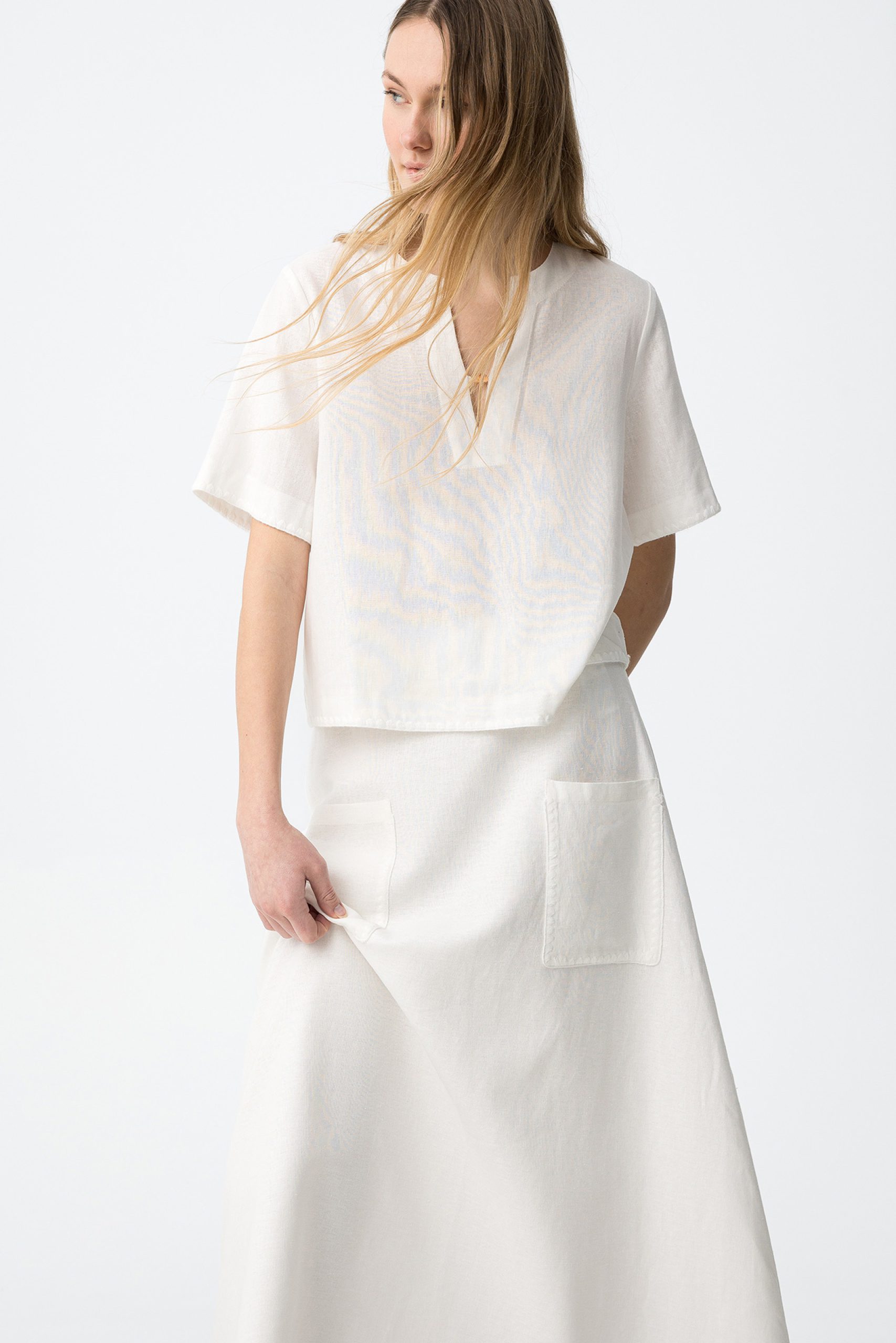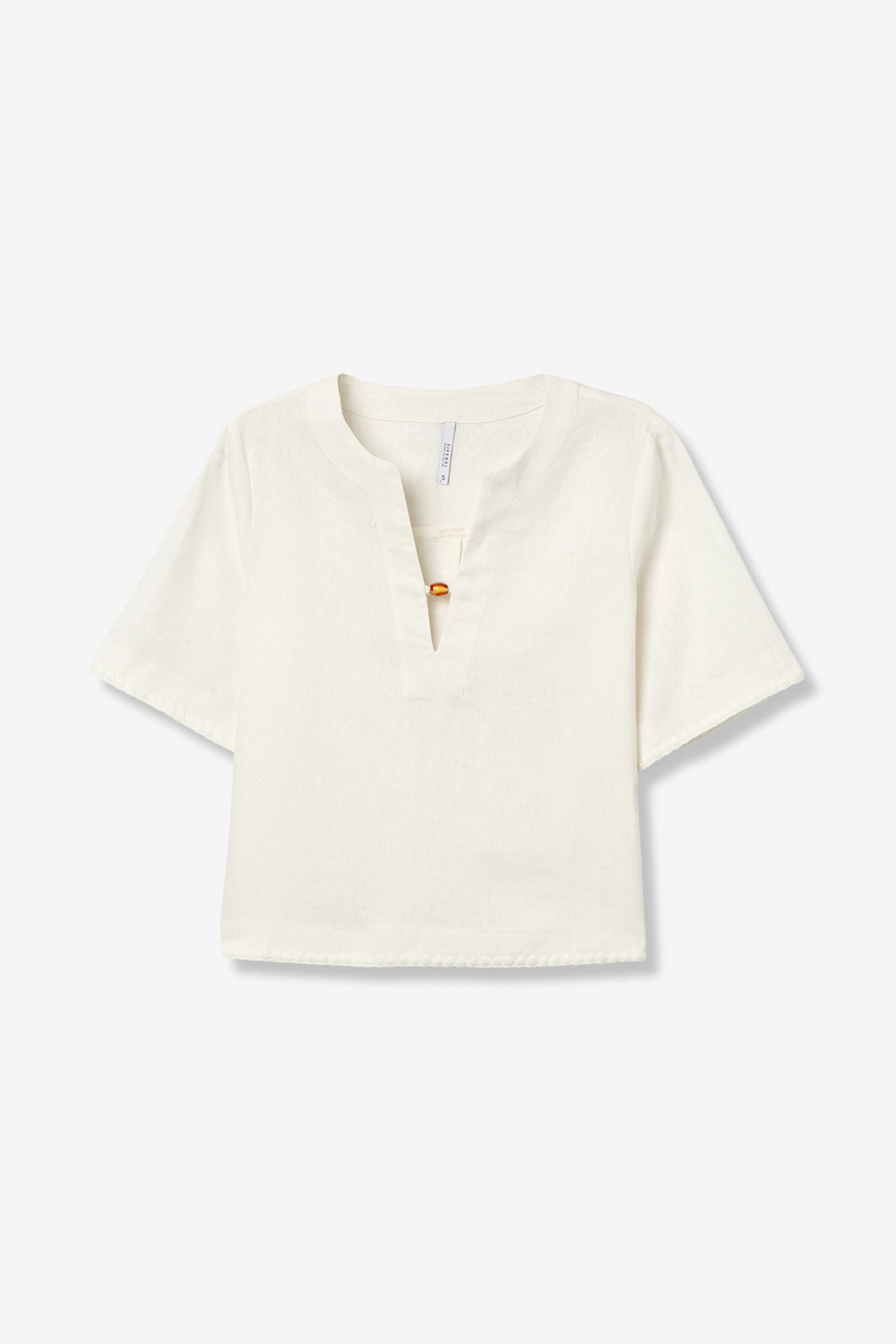 - Κοντά μανίκια και V λαιμόκοψη με μινιμαλιστική λεπτομέρεια.