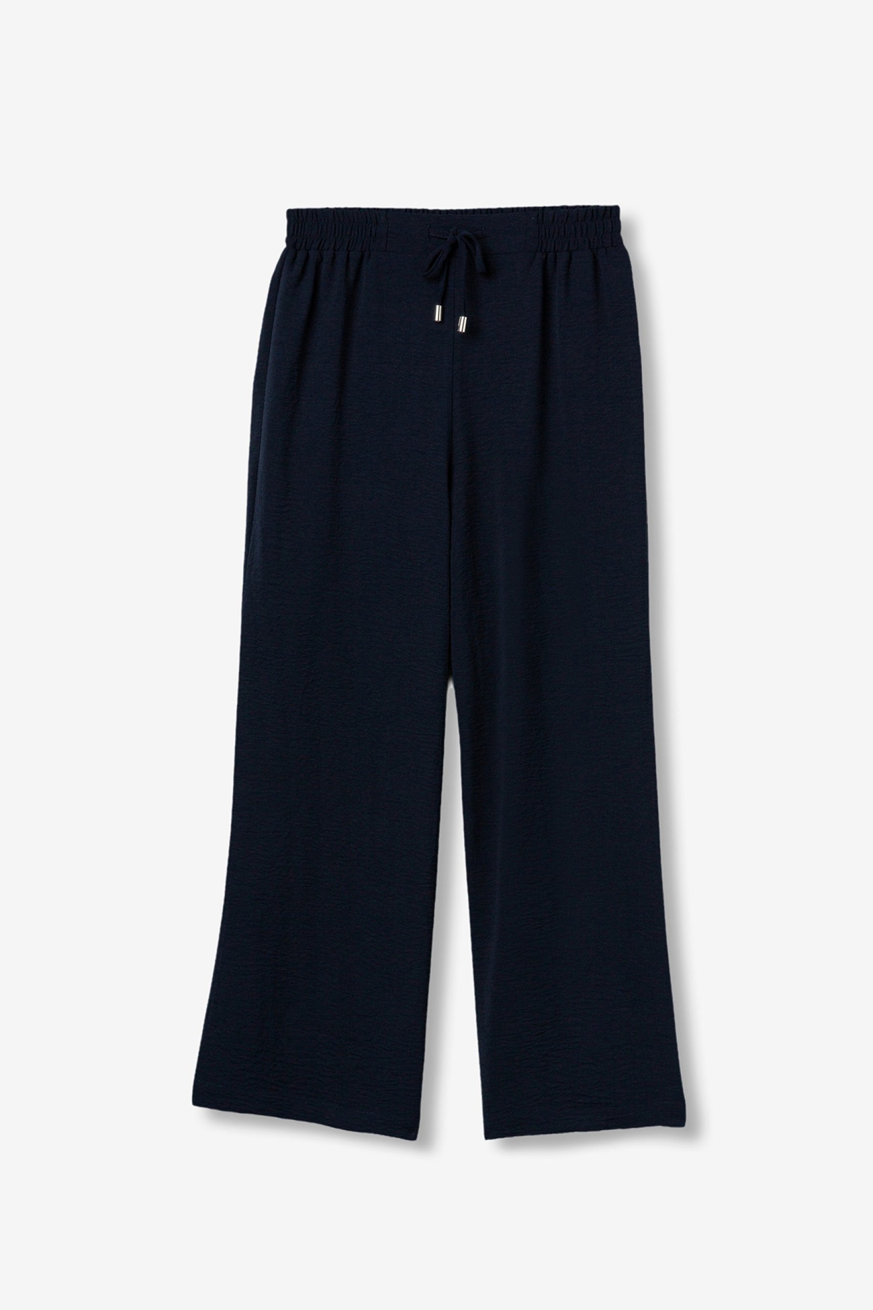 - Σκούρο μπλε παντελόνι, με φαρδιά γραμμή, ψηλή μέση με λάστιχο και ρυθμιζόμενο κορδόνι.